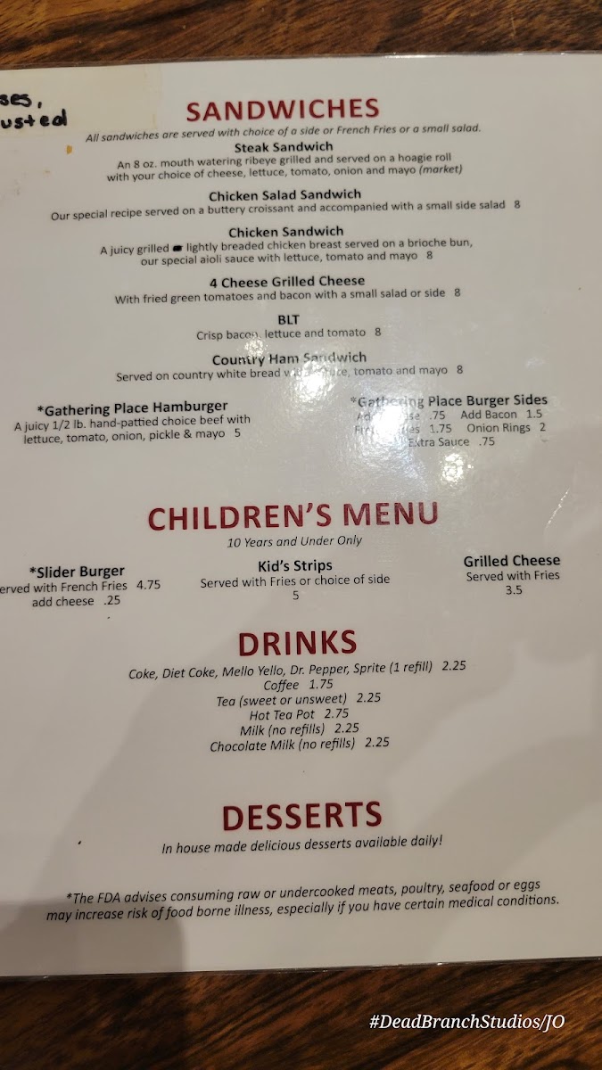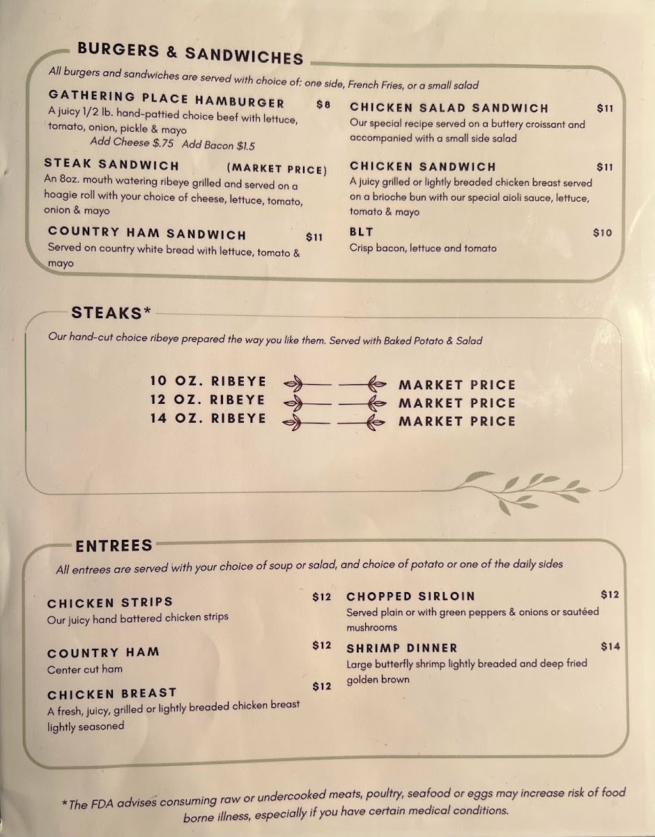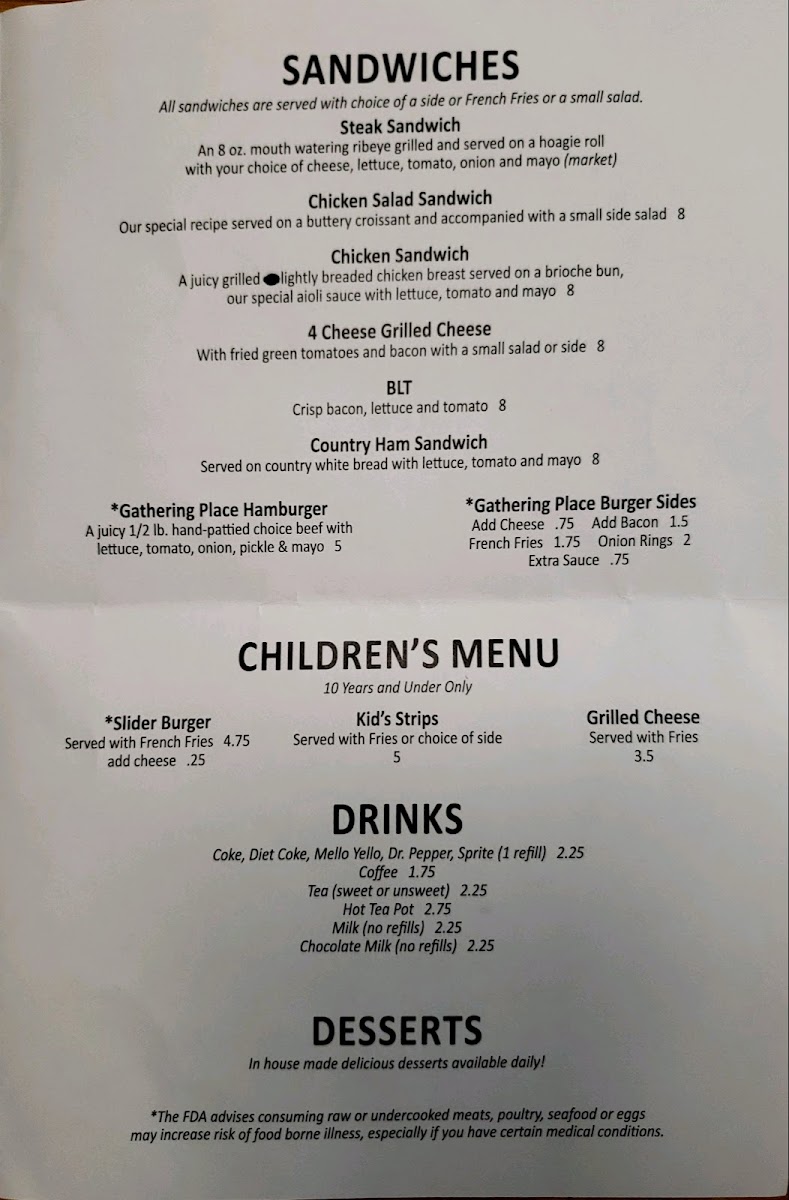 Welcome to Gathering Place Cafe Menu, located at 4500 107 Cutoff in Greeneville, TN. This cozy spot offers a delightful range of dishes, perfect for anyone looking to enjoy a relaxed meal with great flavors. Whether you're stopping by for breakfast, lunch, or dinner, there’s something for every taste. From hearty comfort foods to lighter bites, the menu is designed to make you feel right at home.